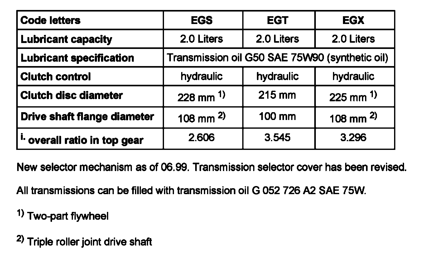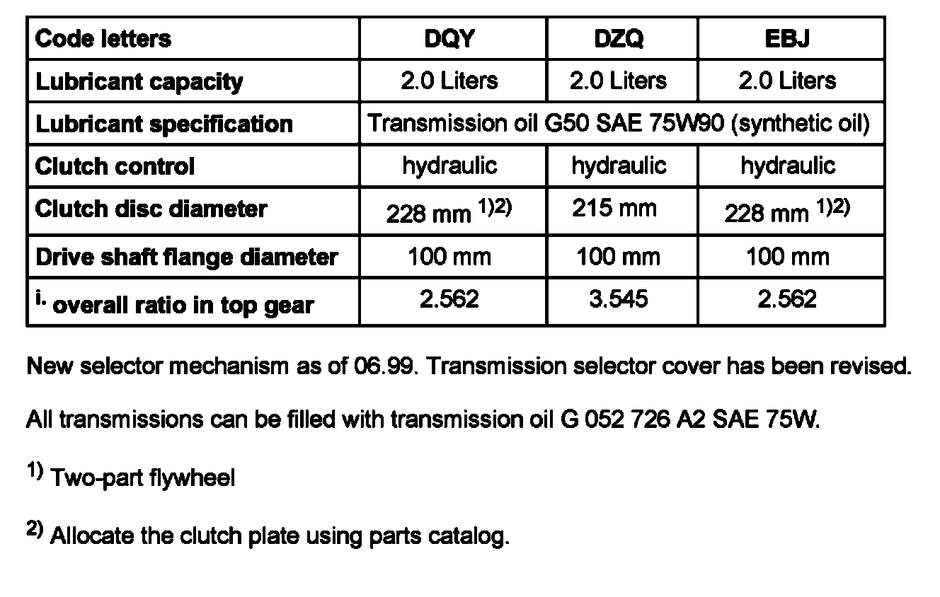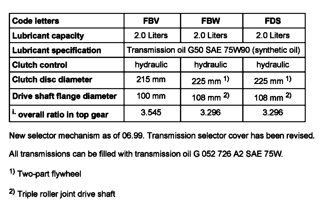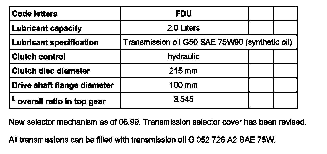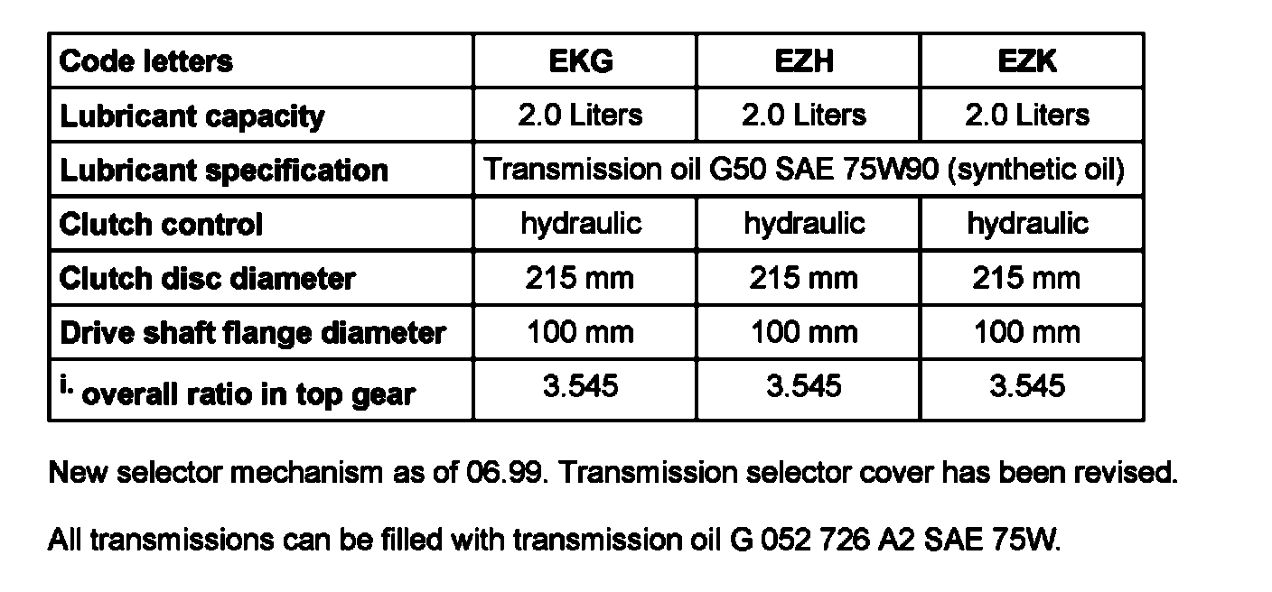 All transmissions can be filled with transmission oil G 052 726 A2 SAE 75W.
