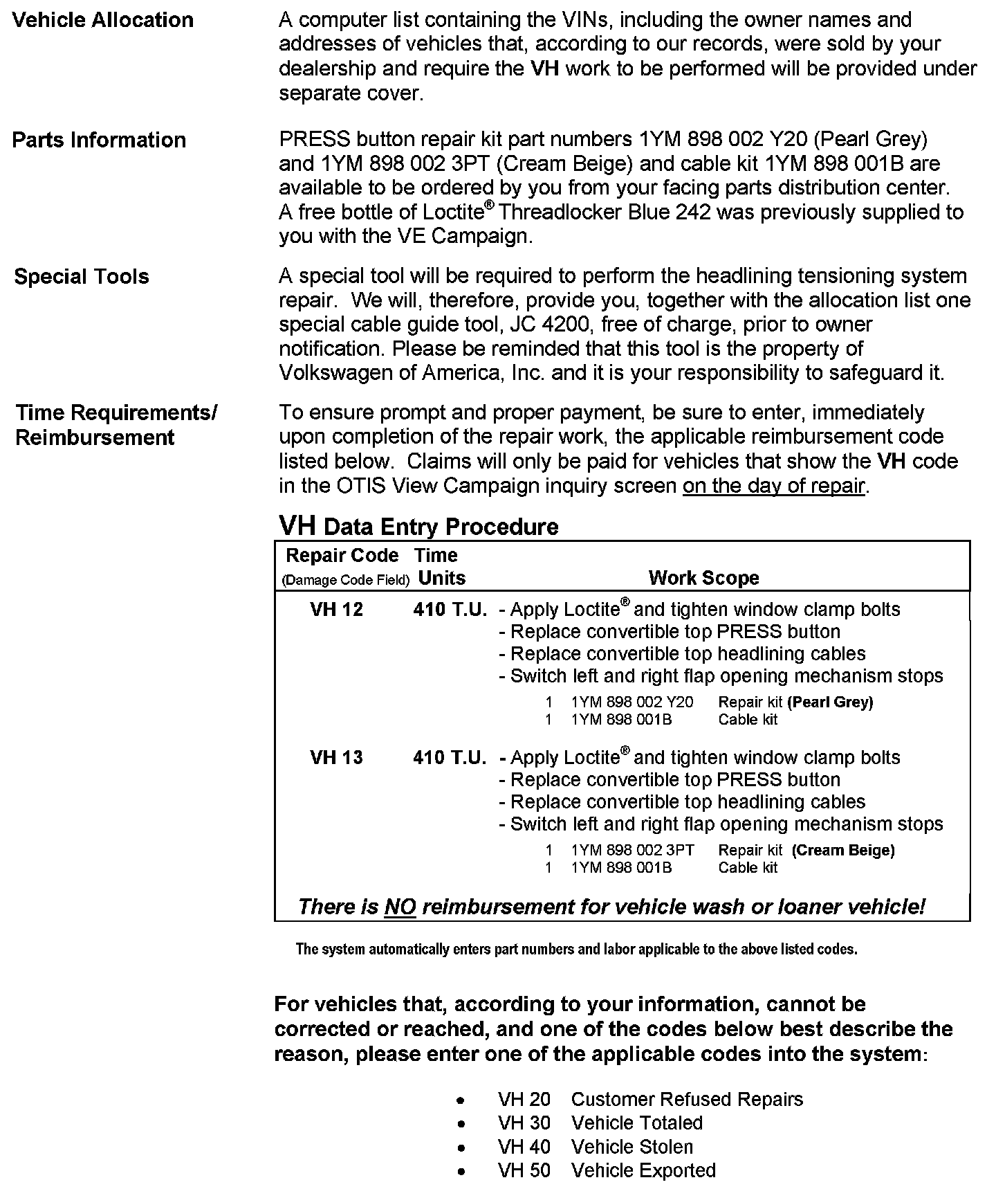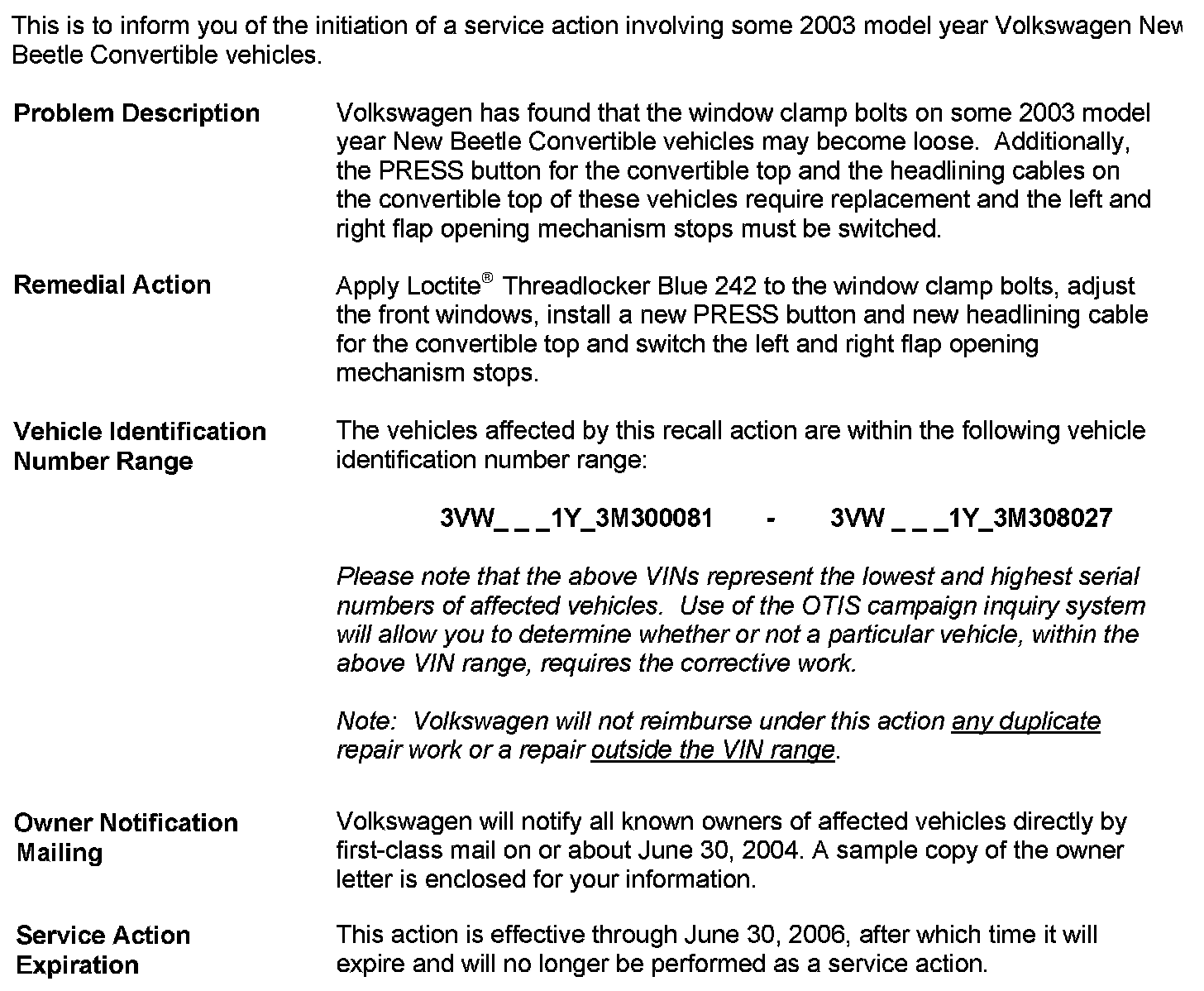 2003 Model Year Volkswagen New Beetle Convertible Vehicles Apply Loctite(R) Threadlocker Blue 242 on Window Clamp Bolts, Adjust Front Windows, Replace Convertible Top PRESS Button, Replace Convertible Top Headlining Cables and Switch Left and Right Flap Opening Mechanism Stops
