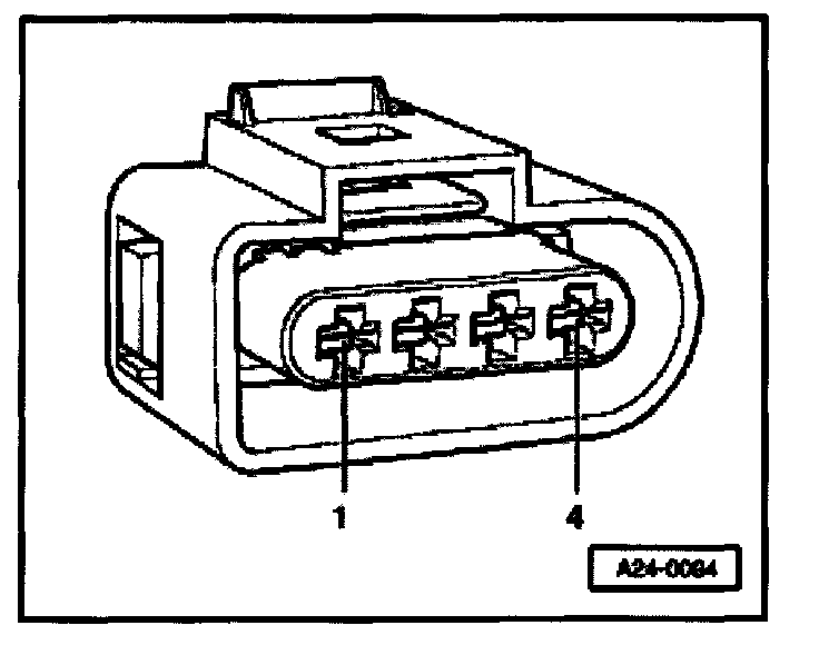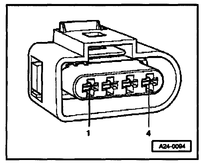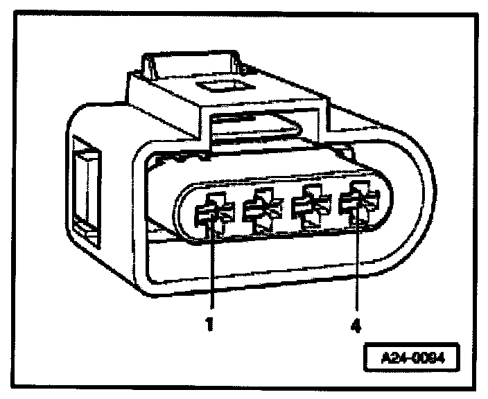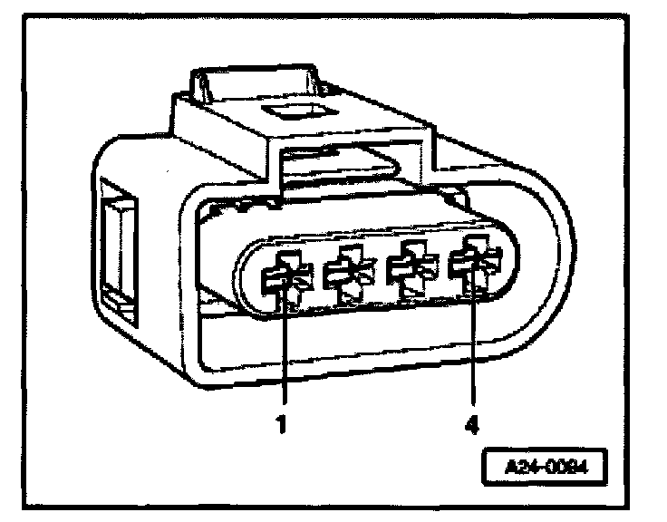- Using multimeter and adapter cables from VAG 1594 measure supply voltage between terminals 1 + 2 and 1 + 4 of disconnected connector.