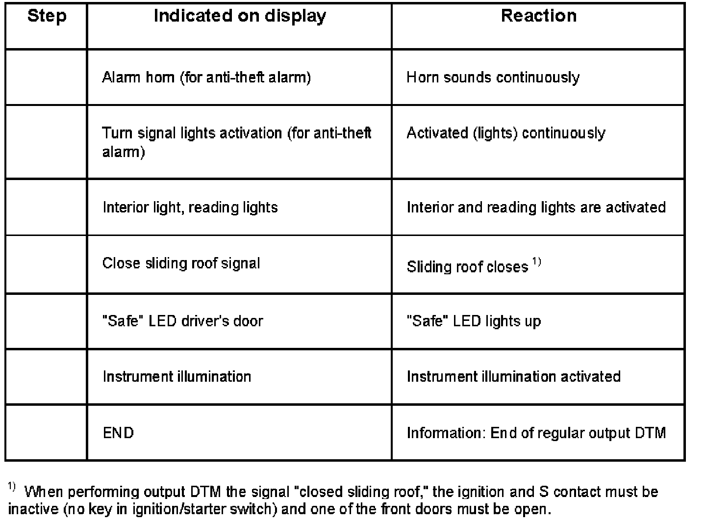 The components displayed in output Diagnostic Test Mode (DTM) can differ depending upon the equipment installed on the vehicle. For example, on vehicles without ATA there will be no "step 1" as listed in the table below.
