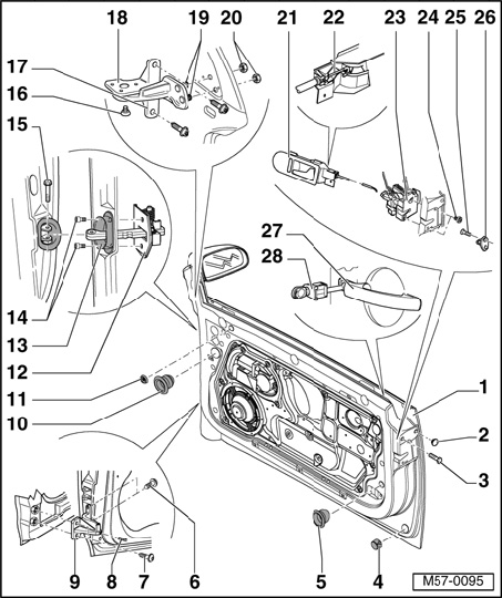 NOTE: Always replace door hinge bolts (except - 6 - and - 16 -) and pin - 19 - after loosening.
