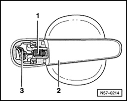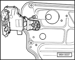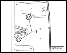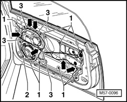 - Remove bolts - 1 -, - 3 - and nut - 2 -. Remove upper subframe from door, lift and lift out from door toward hinge side of door.
