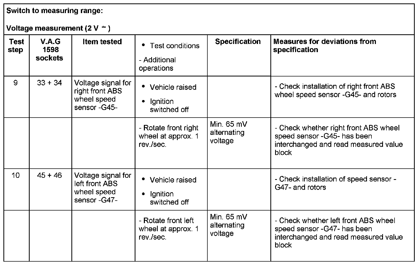 ^ If the readings obtained deviate from the specifications, carry out malfunction repair measure in the right-hand part of the table.