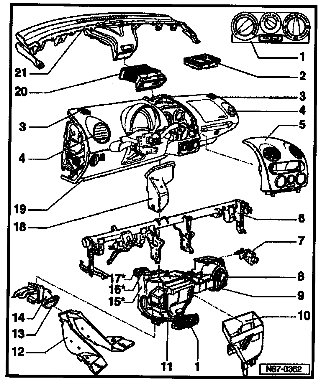 - Loosen instrument panel cross member. Refer Fig. 5 in "Heating and Ventilation System, Assembly" Service and Repair