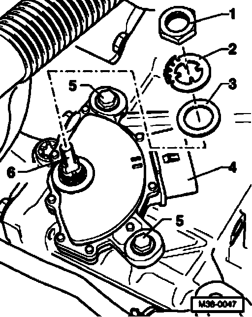 - Fit spring ring -2- and nut -1- onto selector shaft -4-.