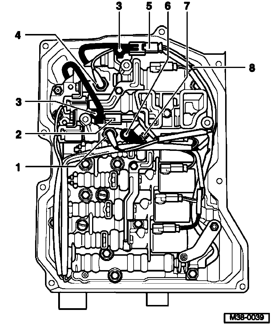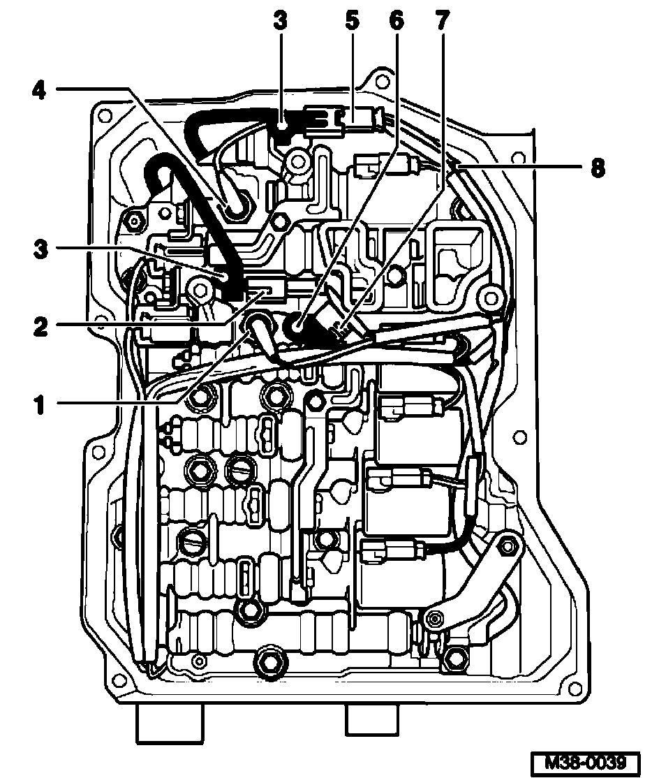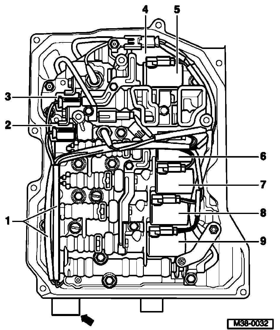 Note: If the wires -3-, -5- and -9- are too short to connect the sensors or too short to be secured to the prescribed locations on the valve body, then the wiring harnesses have been routed incorrectly or are trapped by the valve body. The valve body must be removed again and the wires must be re-routed correctly.