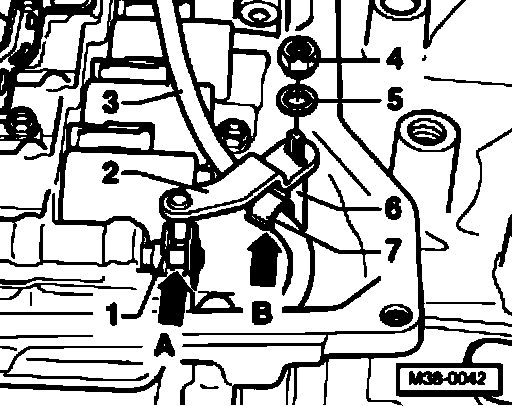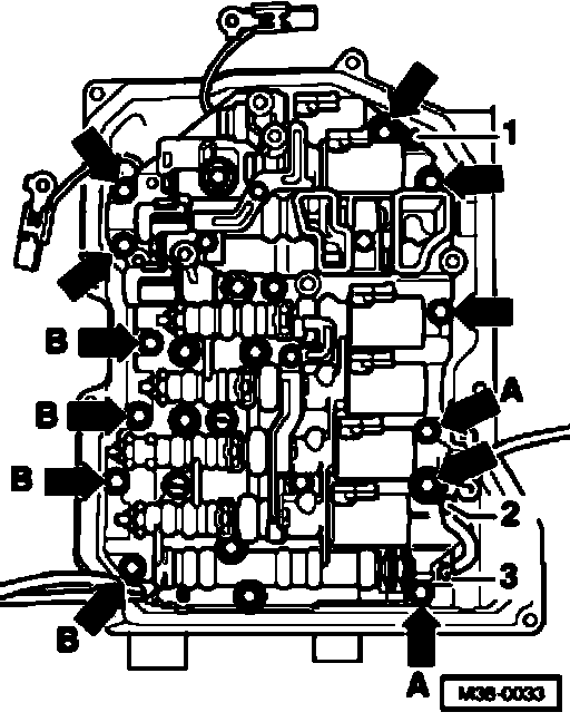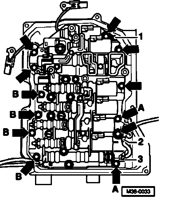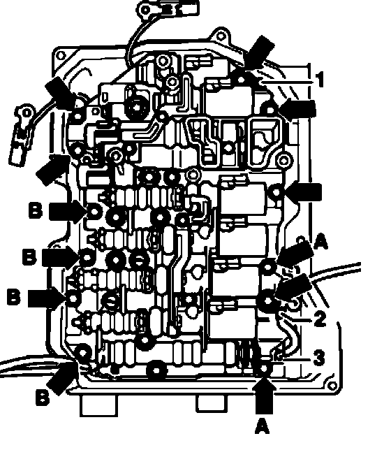 - Tighten remaining valve body new bolts/screws (arrows, arrows -A and arrows -B-) hand tight.