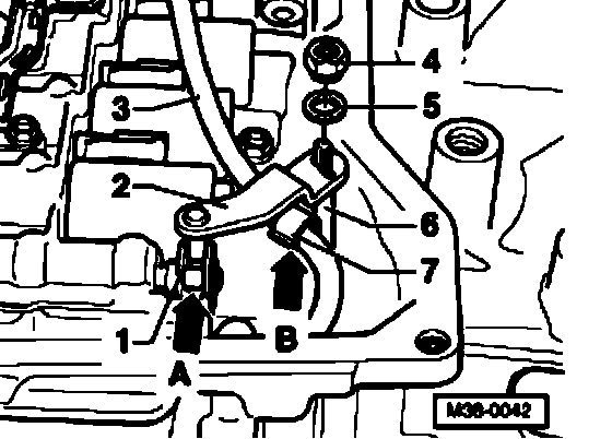 ^ Carefully hold the selector lever -1- with a pair of pliers -2-, so that the torque is not transmitted to the Multi-function TO switch -F125-.