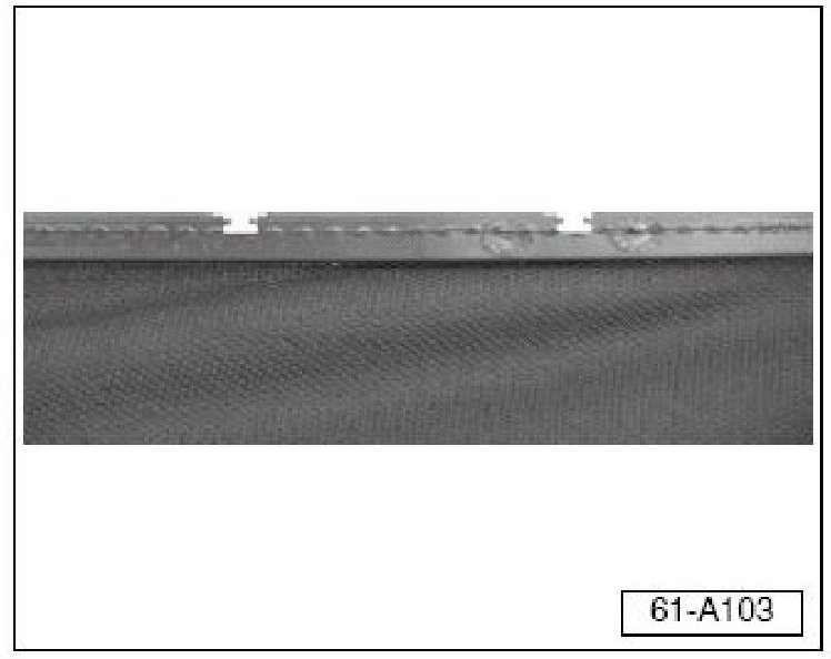 - Install 18 clips Part No: 1Y0871234A (silver) around the headliner beading (1 at each notch (black arrow) cut into the beading as follows: