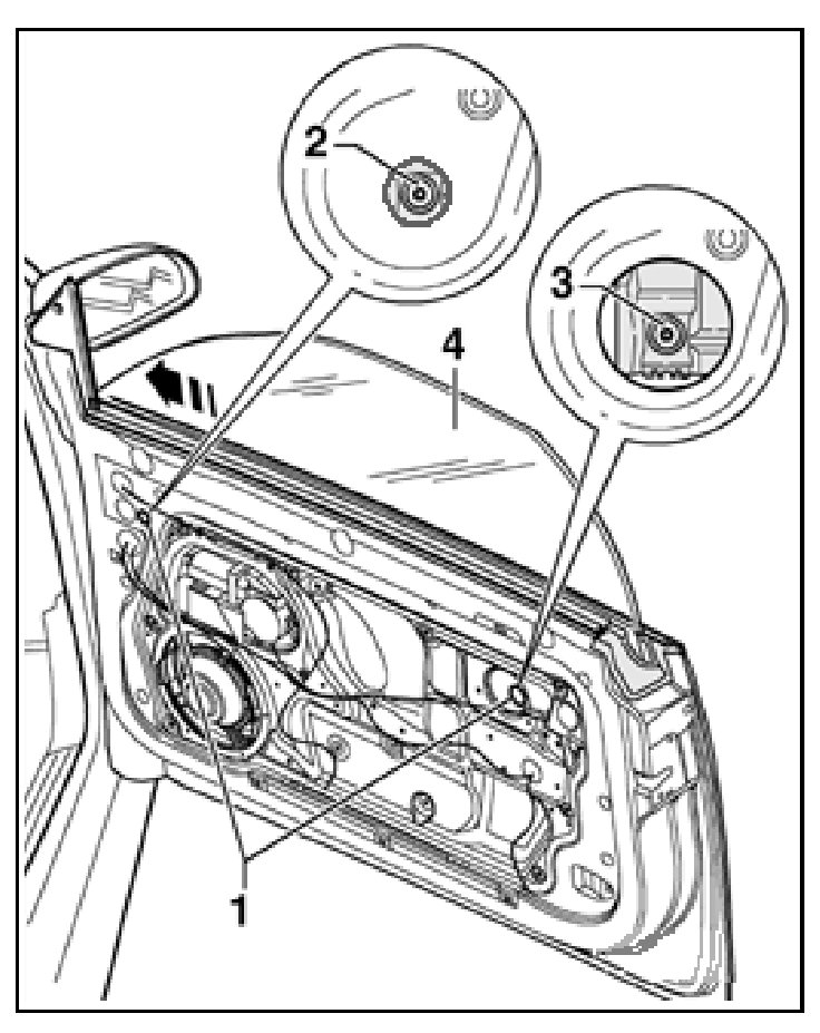 - Lower window completely and raise back to previous position where bolts -2- and - 3- are visible through holes -1-
