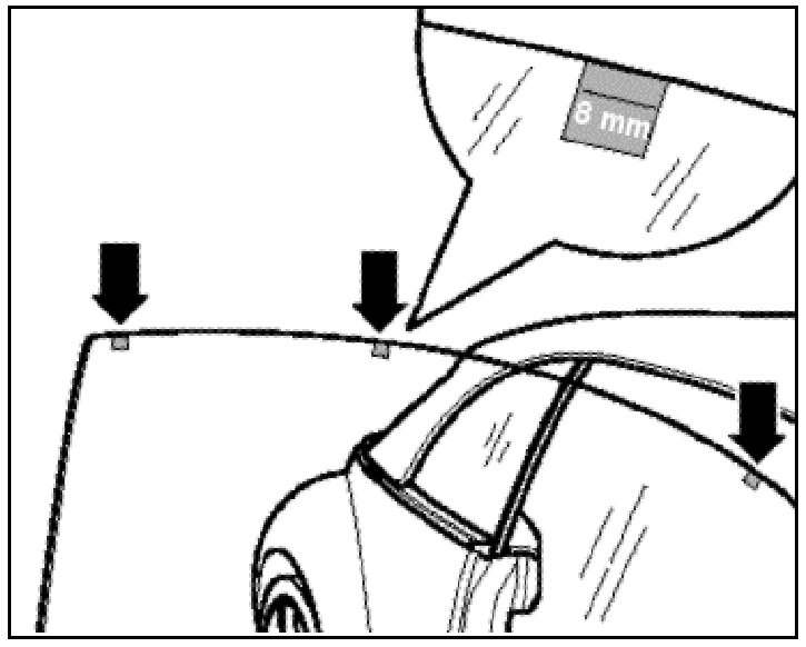 - With the door closed and window in the full up position, check to see if the window top rear corner is 1.0 mm (.0.40 in.) outward of the rear window glass