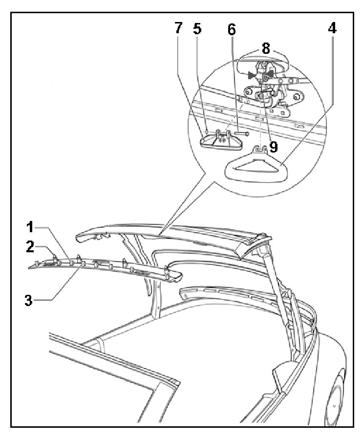 - Unclip roof frame trim panel -1- by prying off rear clips -3- then front clips -2-