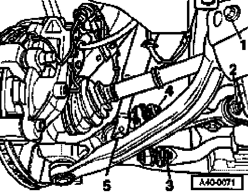 - Unscrew bolts -1- and -2- at rear of subframe on both sides of vehicle.