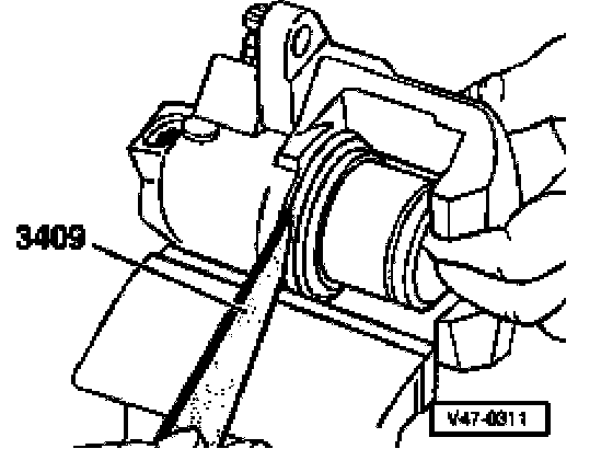 ^ Press piston into the brake caliper housing using piston resetting tool.