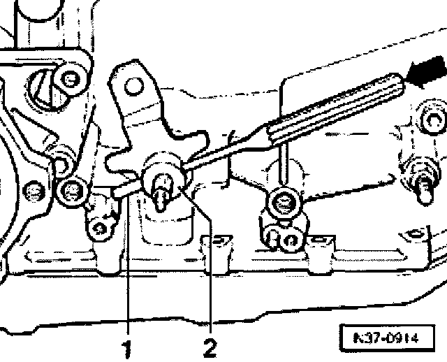 - Drive spring pin -1- out of transmission selector lever-2- -arrow- until transmission selector lever can be removed from selector shaft.