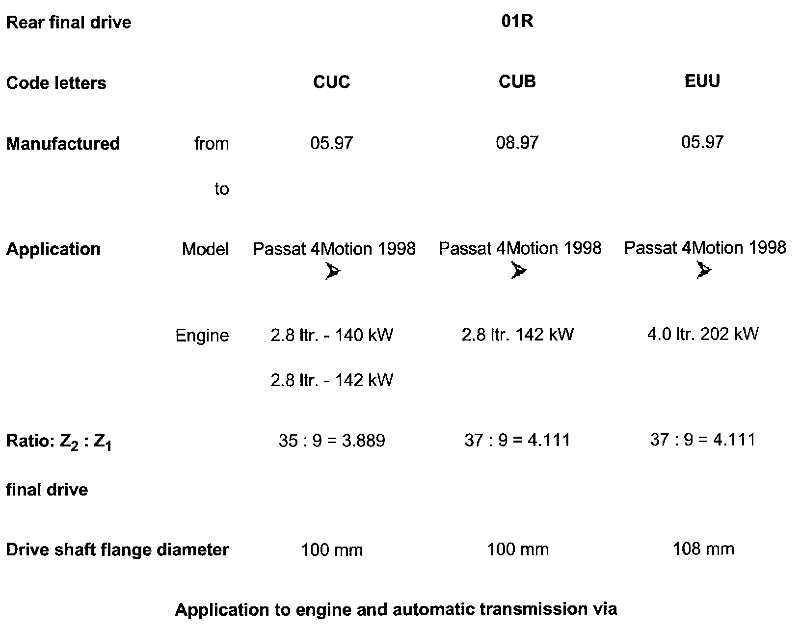 If the rear final drive is to be replaced, it is absolutely necessary to note the code letters of not only the automatic transmission but also the engine of the vehicle in, Parts catalog. Only then is a correct application guaranteed.