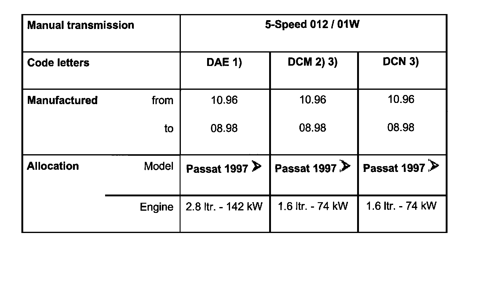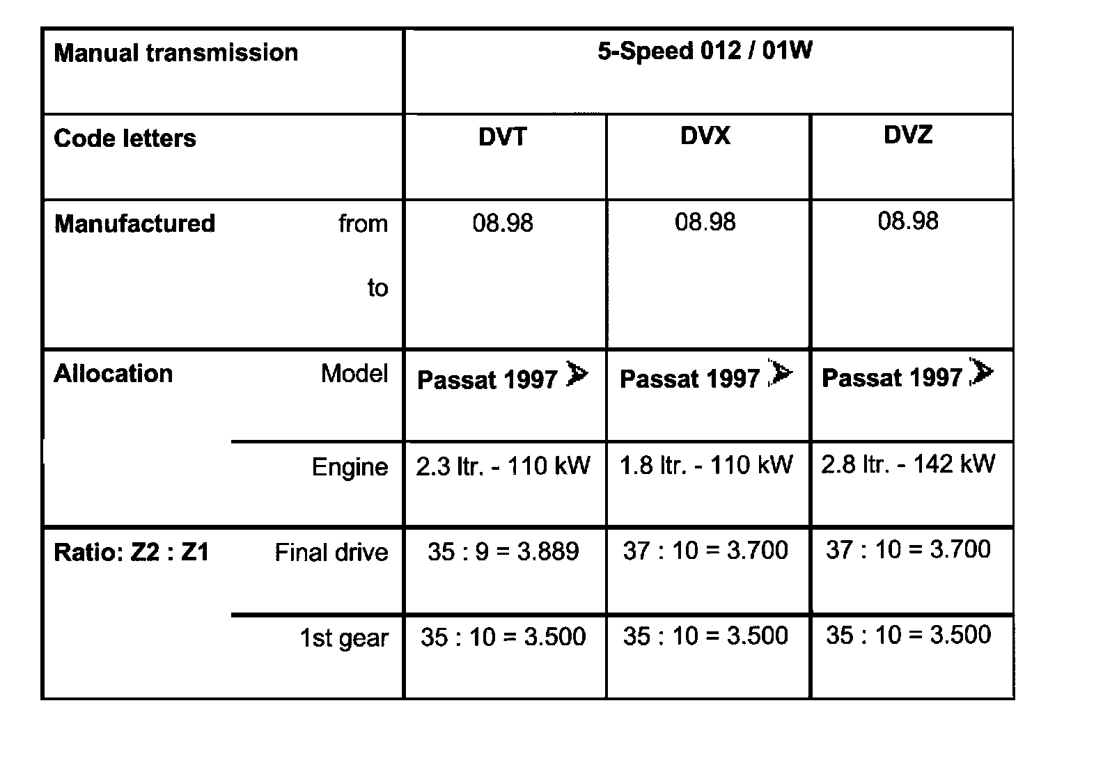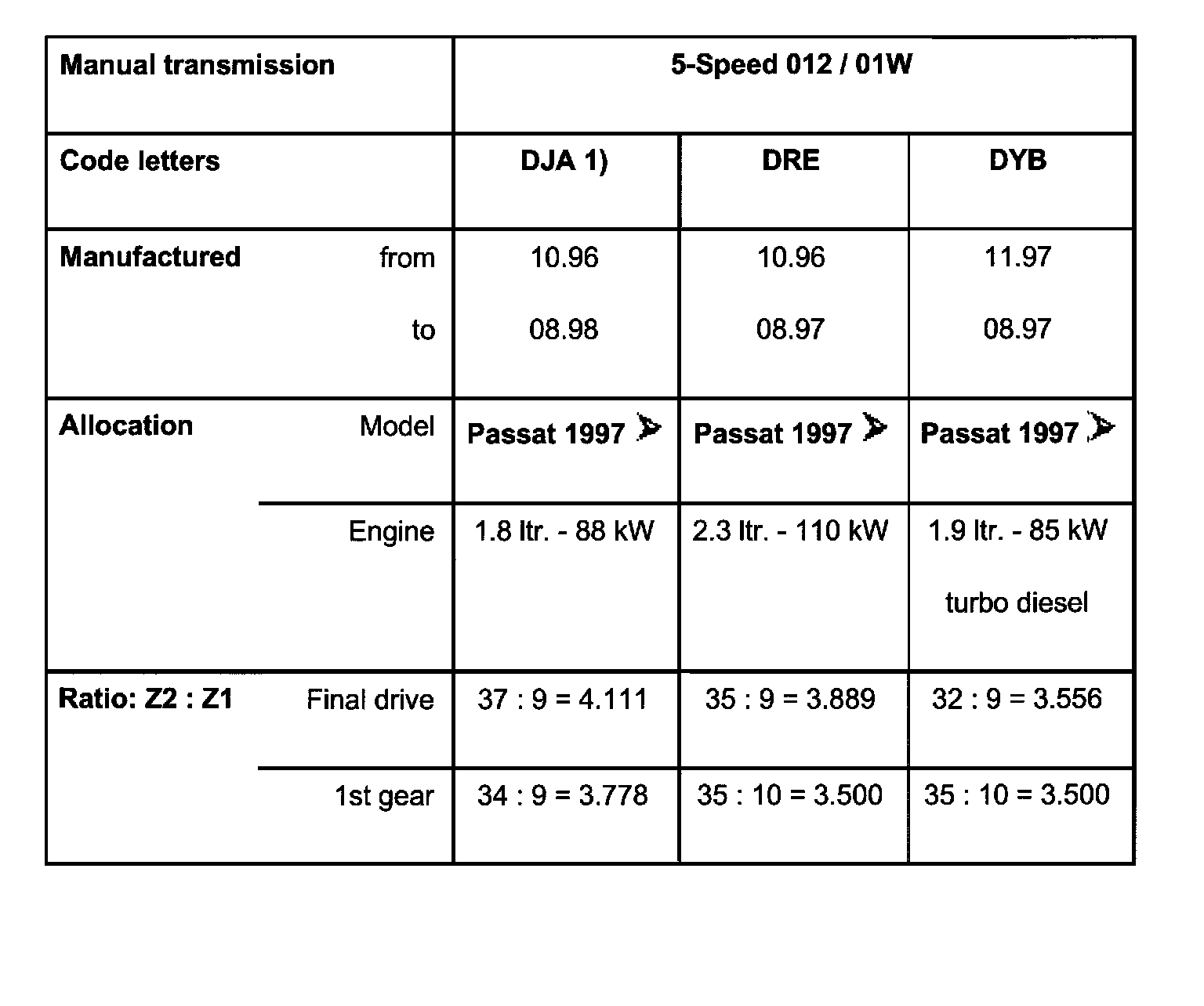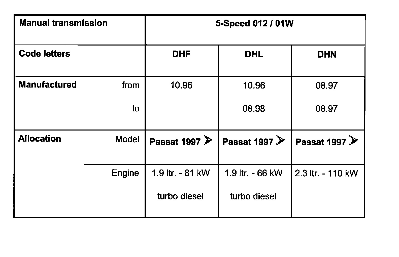 The manual transmission 012/01W is installed in the Passat 1997, as a 5 speed transmission in conjunction with the 4-Cyl. engine, 5-Cyl. injection engine and 6-Cyl. injection engine.