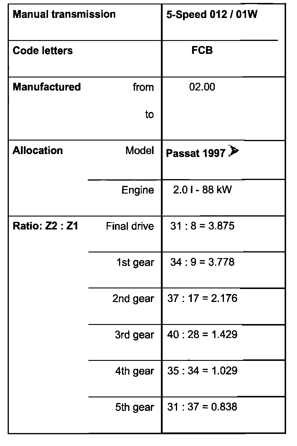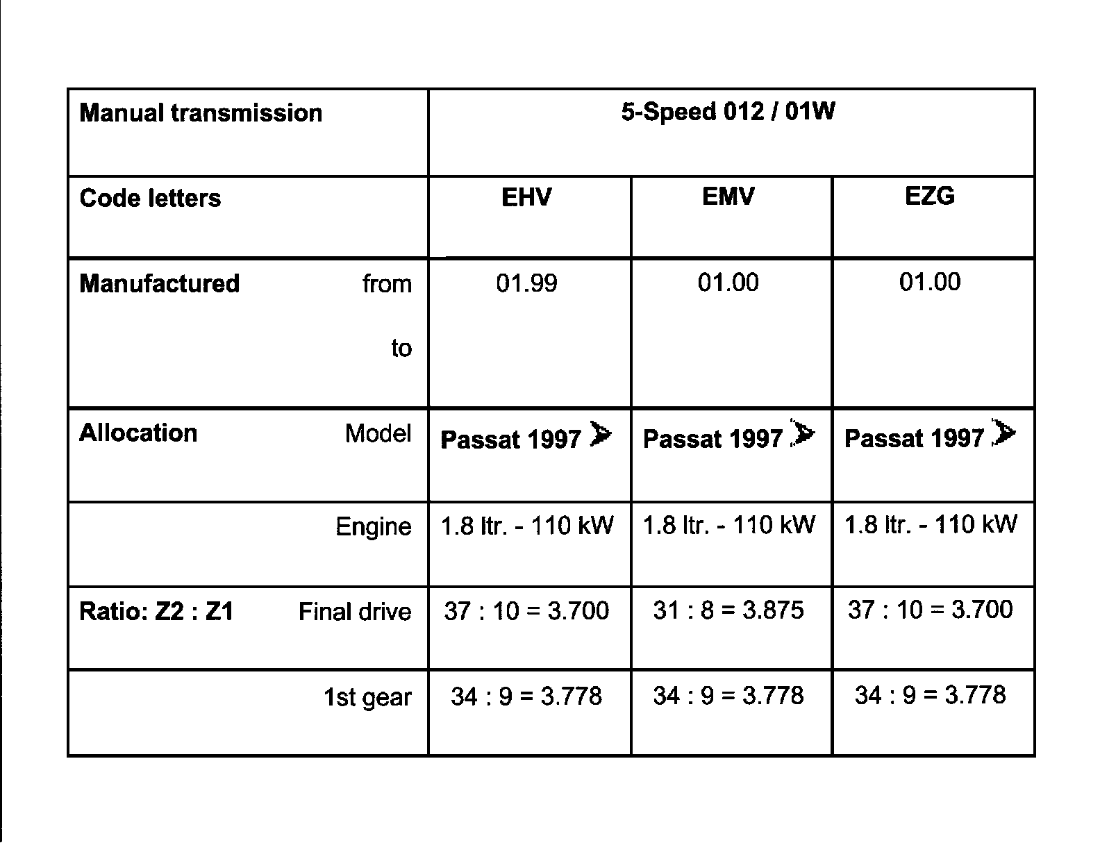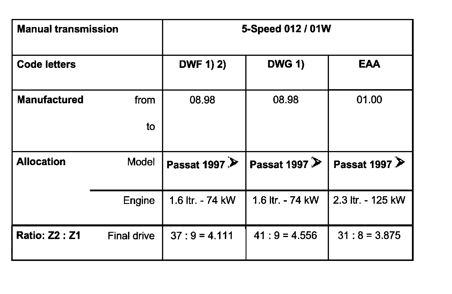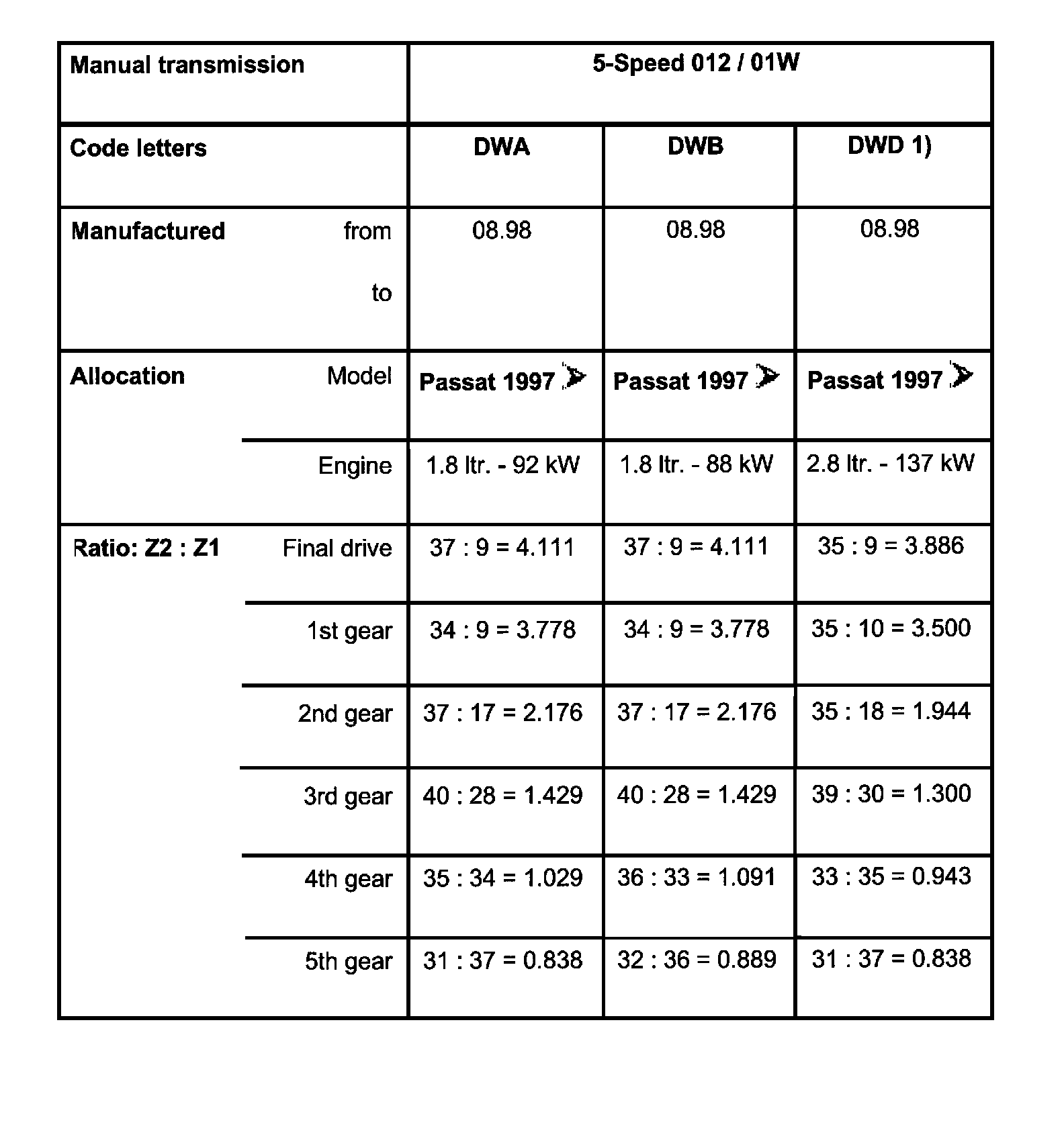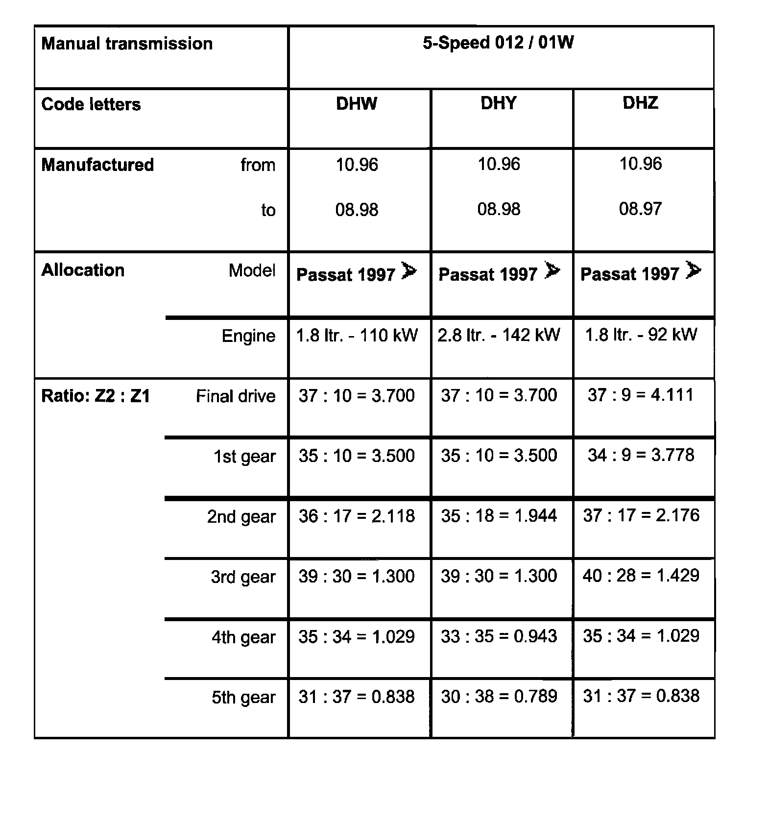 The manual transmission 012/01W is installed in the Passat 1997, as a 5 speed transmission in conjunction with the 4-Cyl. engine, 5-Cyl. injection engine and 6-Cyl. injection engine.