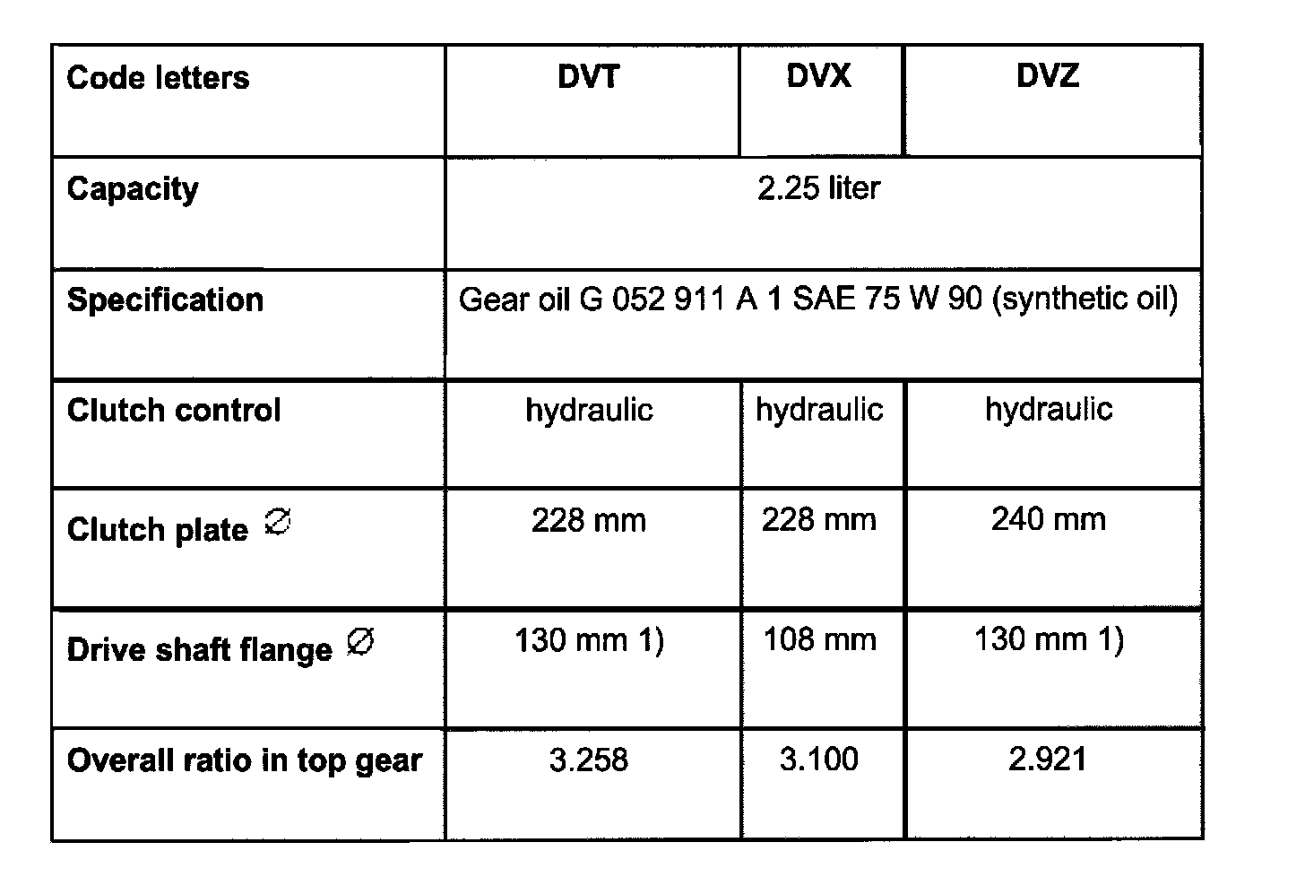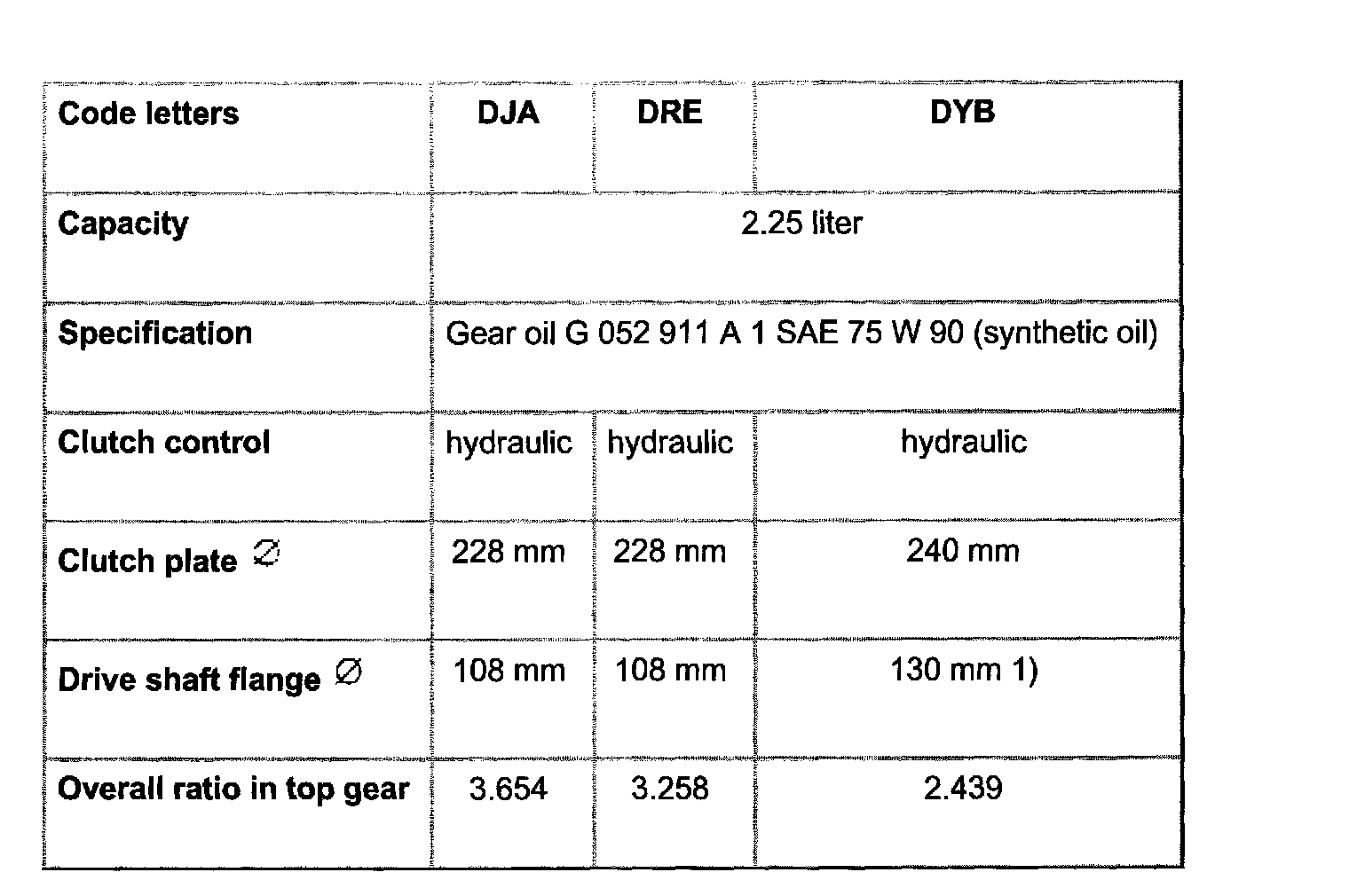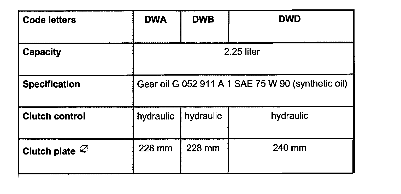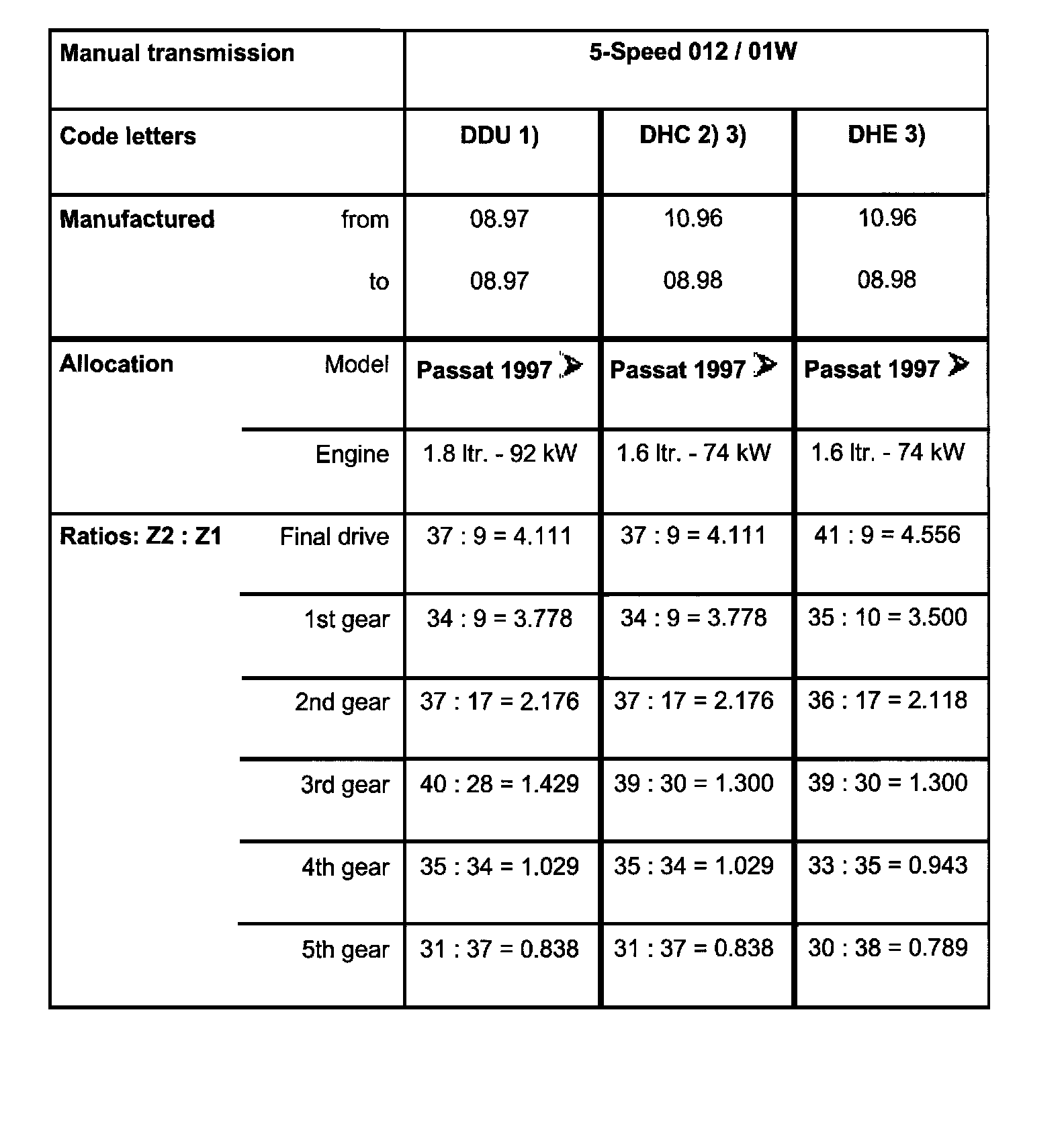 The manual transmission 012/01W is installed in the Passat 1997, as a 5 speed transmission in conjunction with the 4-Cyl. engine, 5-Cyl. injection engine and 6-Cyl. injection engine.
