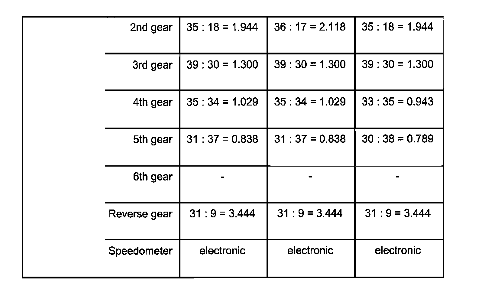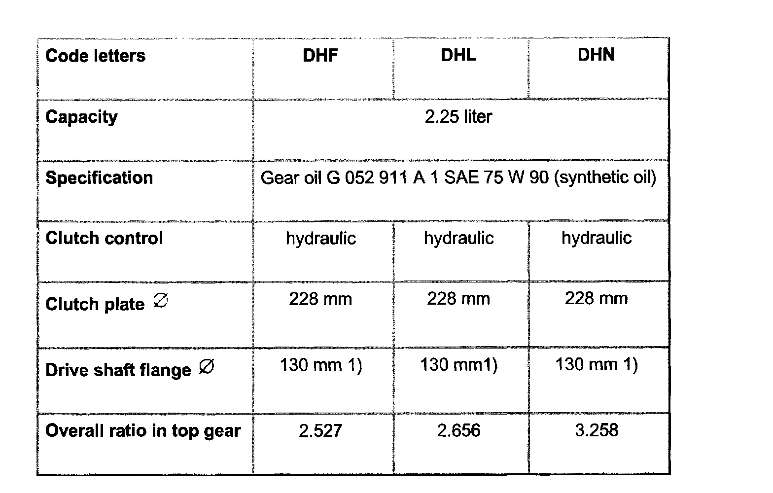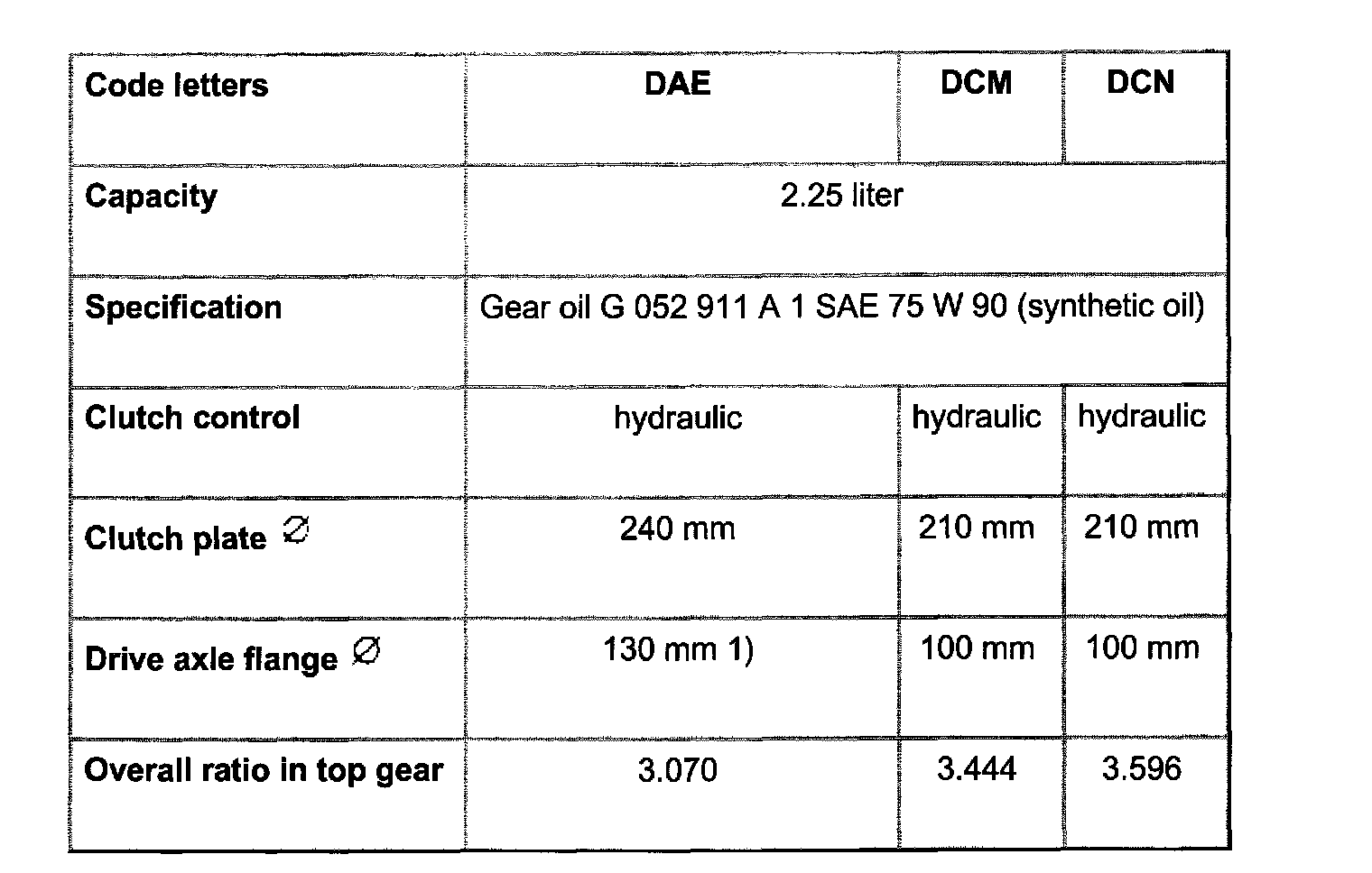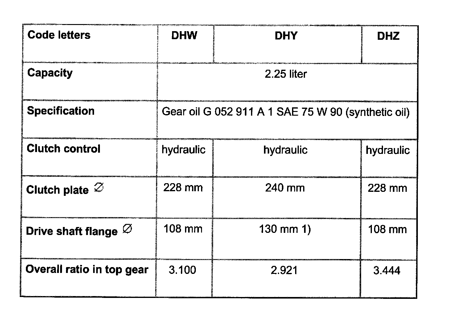 The manual transmission 012/01W is installed in the Passat 1997, as a 5 speed transmission in conjunction with the 4-Cyl. engine, 5-Cyl. injection engine and 6-Cyl. injection engine.