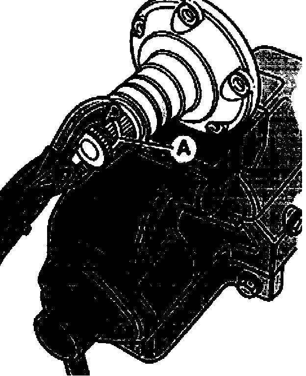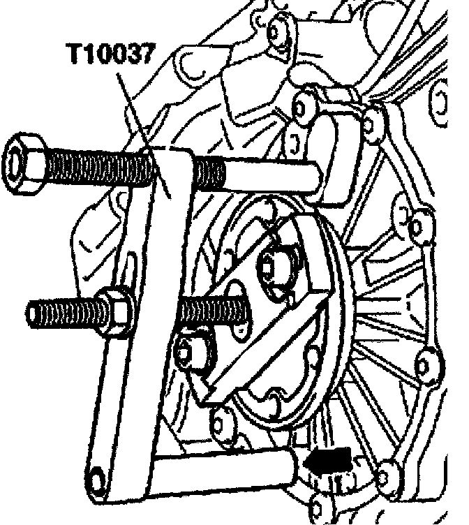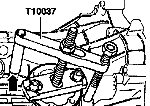 - Remove flange shaft, to do this secure puller T10037 to transmission housing (arrow).