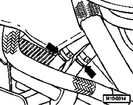 ^ Separate lines to oil cooler at unions (arrows) and collect ATF which may leak out in a suitable container.