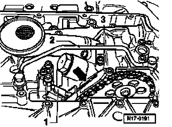 ^ Lock chain tensioner -1- using a 2.5 mm drill bit (arrow) and remove tensioner.