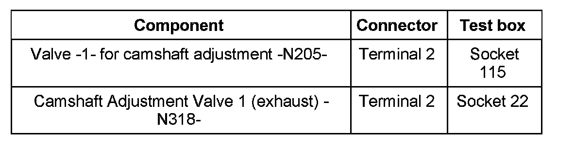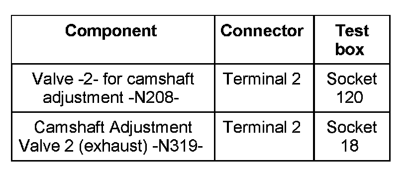 - Measure resistance between terminals at connector to the respective valve for camshaft adjustment.