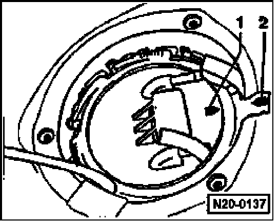 - Note installation position of fuel delivery unit flange: Mark on flange - 1 - must align with mark on fuel tank - 2 -.