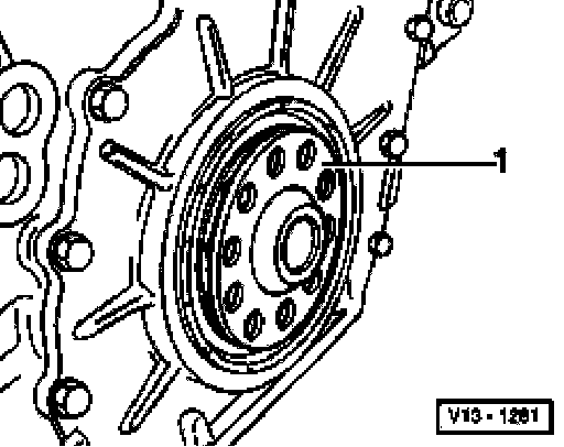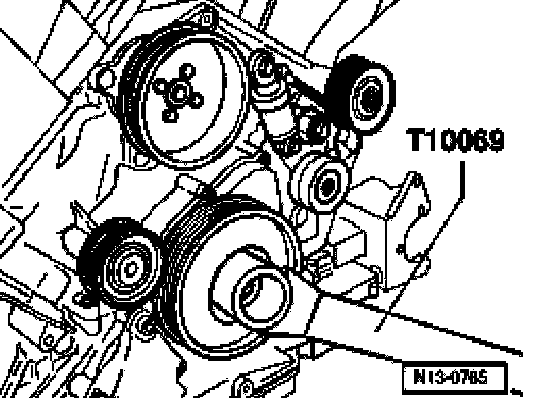 ^ Remove drive plate by locking vibration damper with counter-holder T10069.
