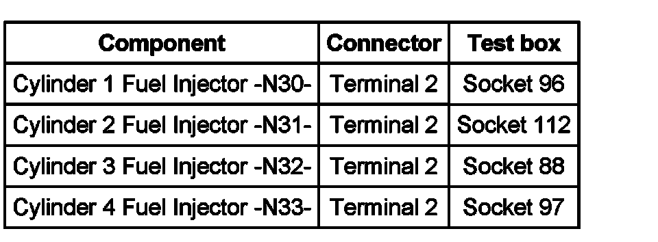 - The respective fuses of fuel injectors (Cylinder 1 Fuel Injector -N30- to Cylinder 4 Fuel Injector -N33-, Cylinder 5 Fuel Injector -N83-, Cylinder 6 Fuel Injector -N84-) must be OK.