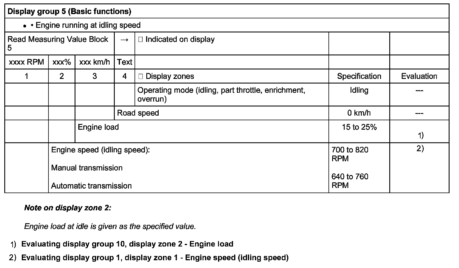 Evaluating display group 1, display zone 1 - Engine speed (idling speed)