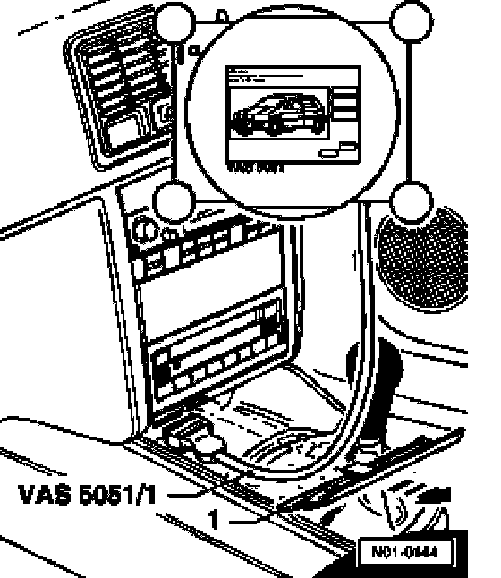 - With ignition switched off, connect tester VAS 5051 to diagnosis connection using diagnosis cable VAS 5051/1 or VAS 5051/3.