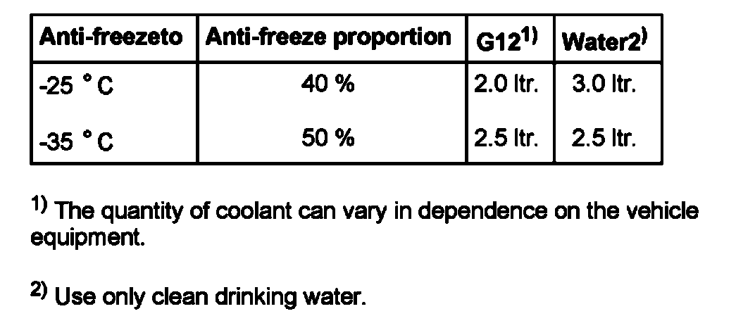 ^ The coolant concentration must not be reduced by adding water even in warmer seasons and in warmer countries. The anti-freeze ratio must be at least 40%.