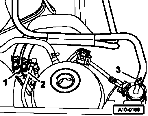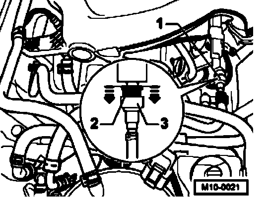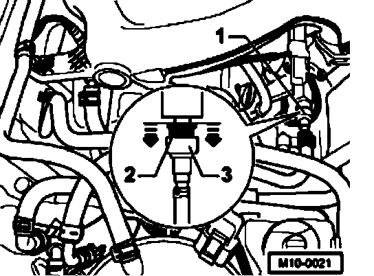 - Disconnect fuel supply line (at connection -1-. To do this slide securing ring -2- in union -3-.