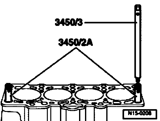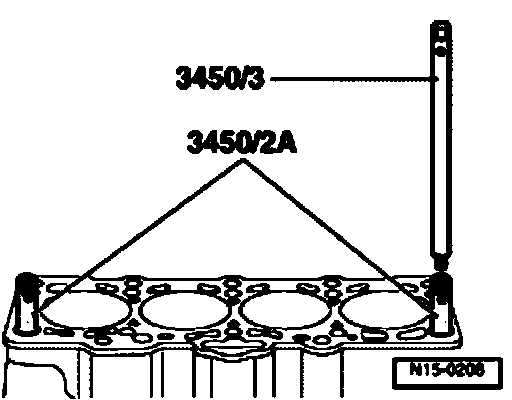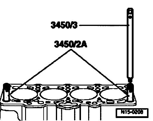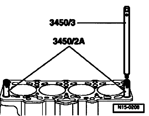 - To centralize, screw guide pins from 3450/2 A into the front outer threaded holes for the cylinder head bolts.