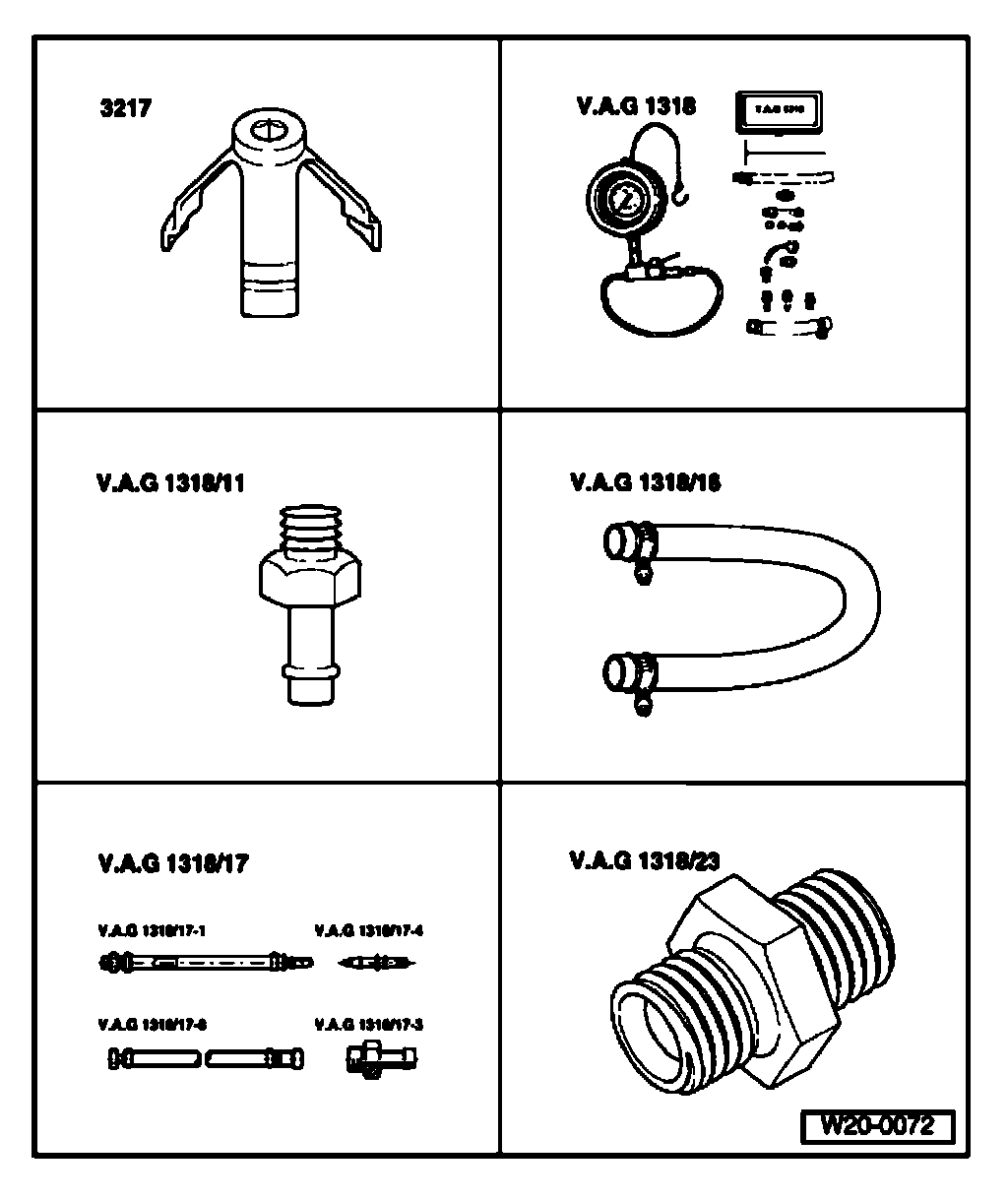 - Connect pressure gauge VAG 1318 to hose with adapter VAG 1318/17.
