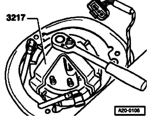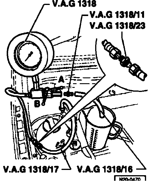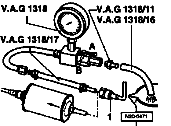 - Connect pressure gauge VAG 1318 with adapter VAG 1318/23 and VAG 1318/17 to fuel supply line.