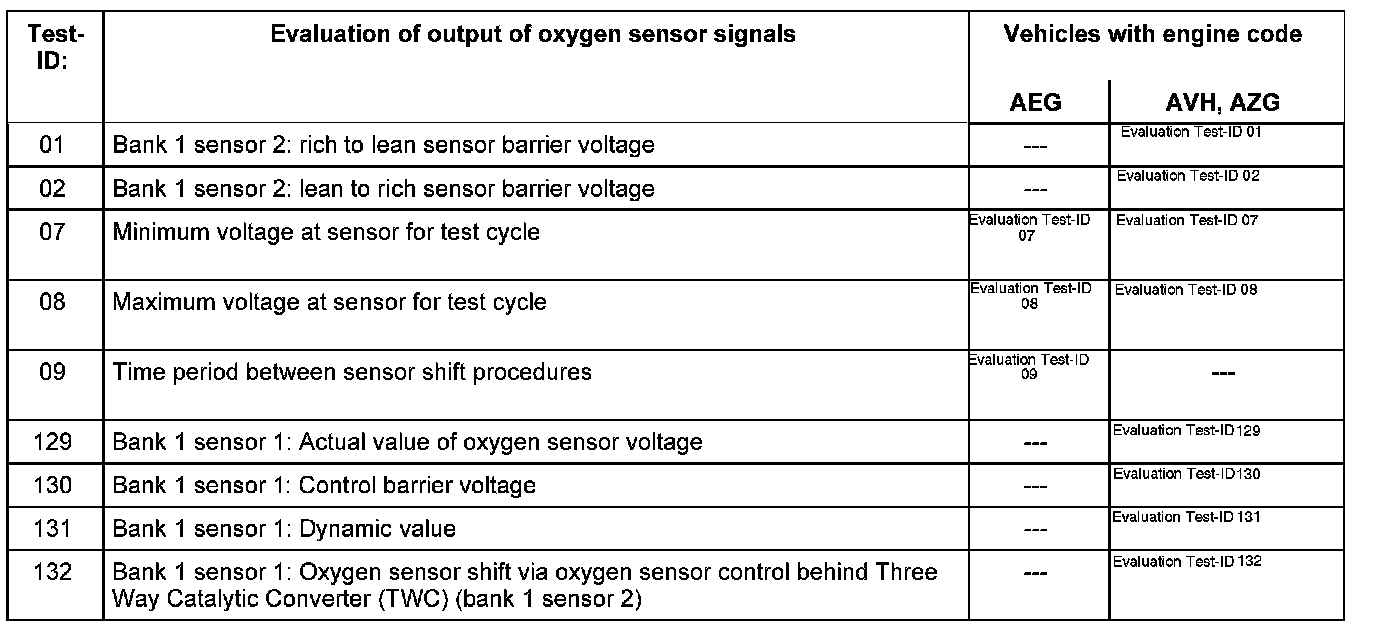 Evaluation test-ID 132 Bank 1 Sensor 1: Oxygen sensor shift via oxygen sensor control behind Three Way Catalytic Converter (TWC) (bank 1 sensor 2) (Vehicles with engine code AVH, AZG)
