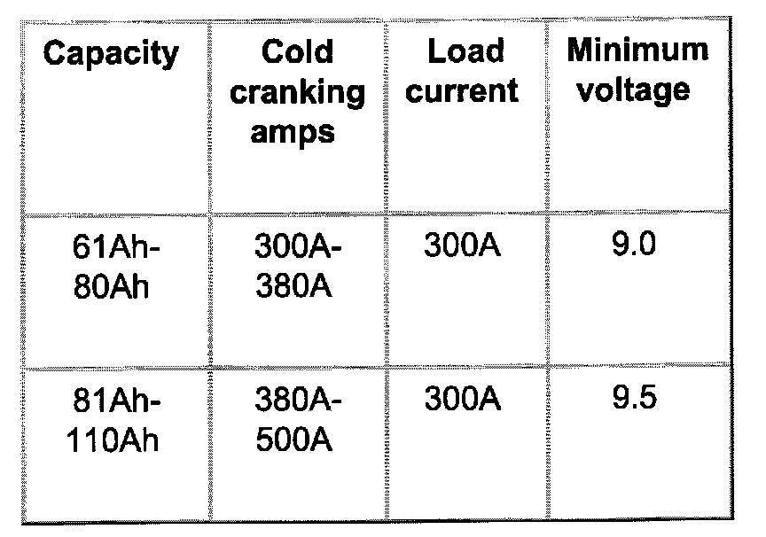 - Load current and minimum voltage specifications vary depending on battery capacity. Apply load as per tester instructions, or for 5 seconds at load specified below: