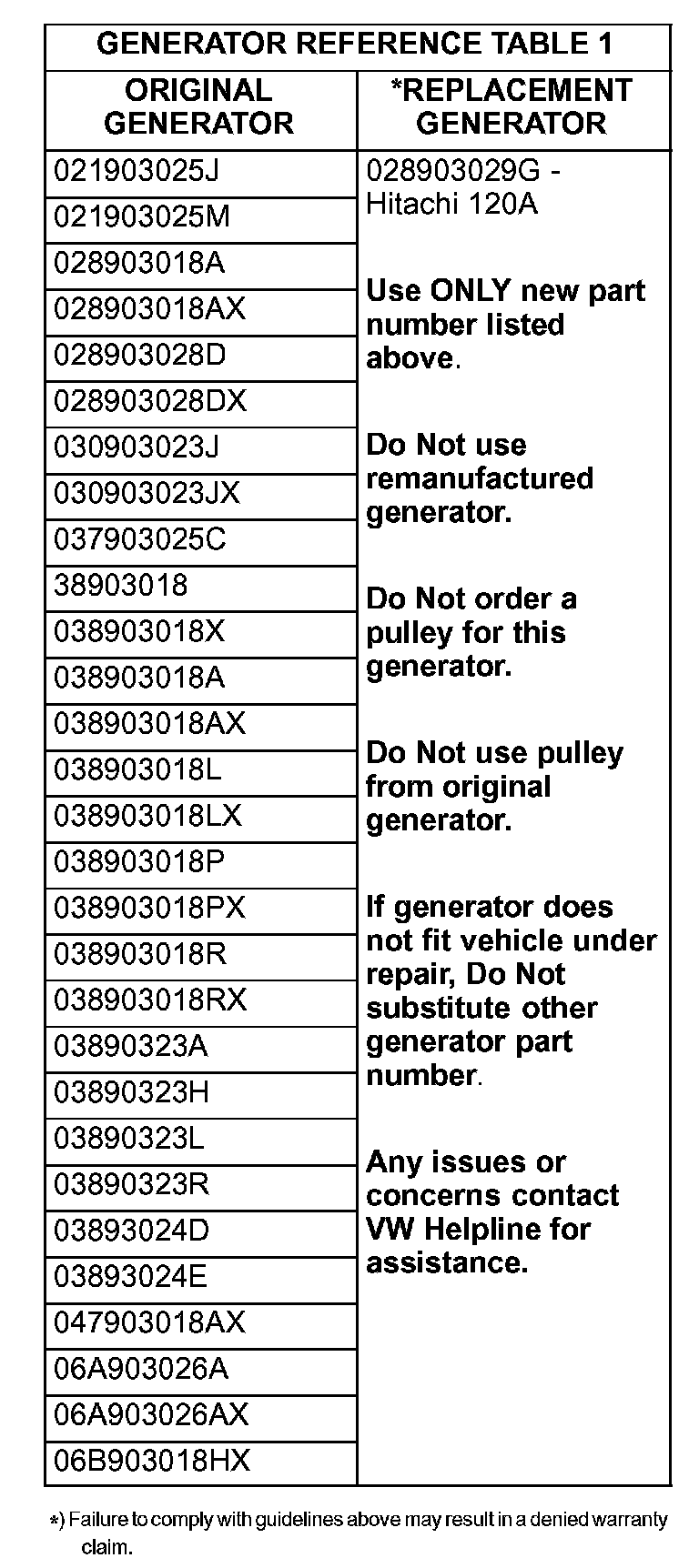 If generator part number is not listed in Table 1, contact VW Helpline for further assistance.