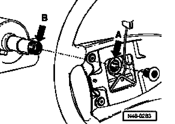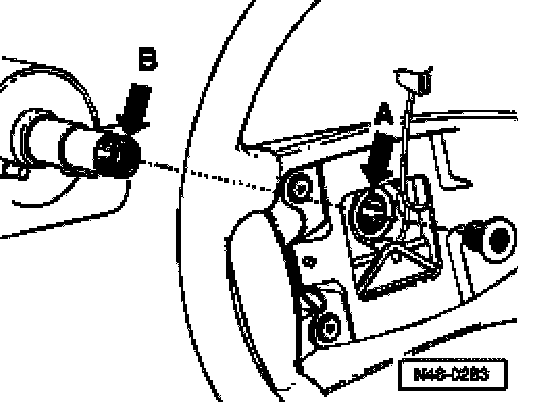 - Install steering wheel so that the marked line -arrow A- on the steering wheel and the center punch mark -arrow B- on the steering column align.