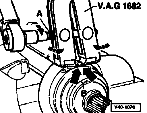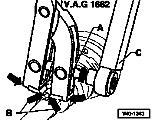 - Install tensioning clamp V.A.G. 1682 as shown in illustration. Make sure that the jaws of the tension clamp seat in the corners - arrows B - of hose clip.