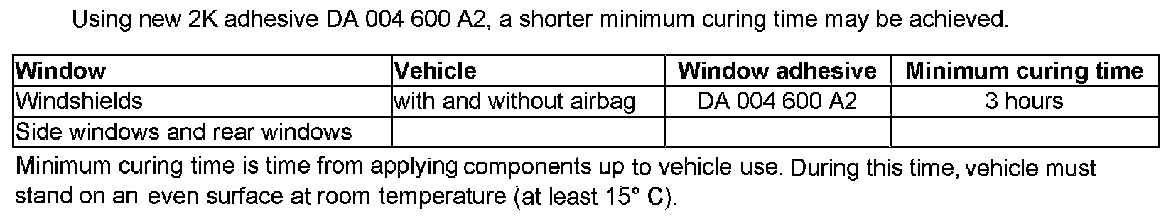 CAUTION: Special requirements must be fulfilled for replacing bonded windows. This includes that e.g. a newly bonded windshield is safe for vehicle operation also in case of an accident after a specified minimum curing time.