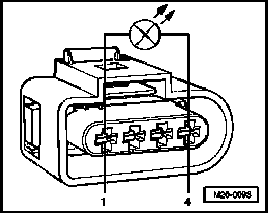 - Connect diode test lamp V.A.G 1527 B with auxiliary cables from V.A.G 1594 A to outer contacts of connector.