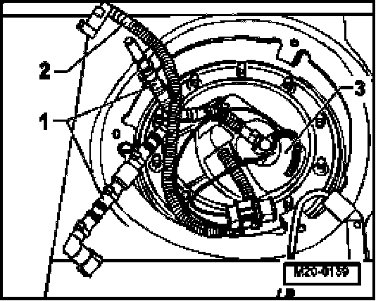 - Take out supply line -1- of flange cut -out and then return hose -2-. Carefully remove fuel supply unit -3-.