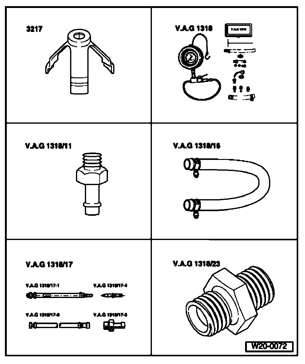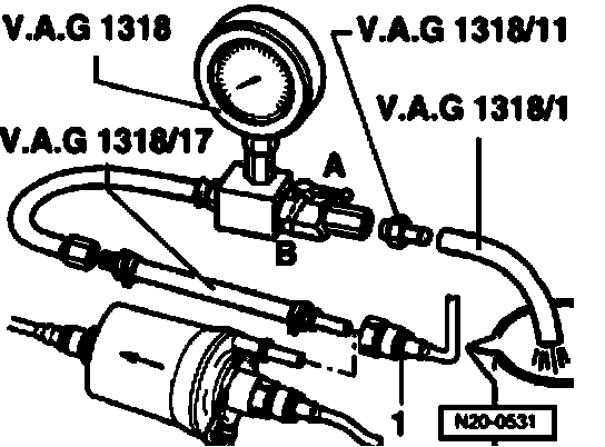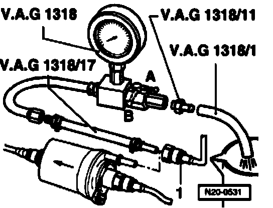 - Connect pressure gauge VAG 1318 with adapter VAG 1318/17 as shown.