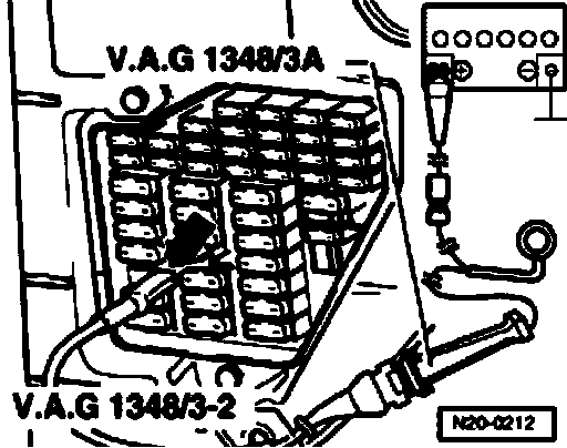 - Connect remote control VAG 1 348/3A with adapter cable VAG 1348/3-2 to contact 28a to fuel pump and battery positive (+).