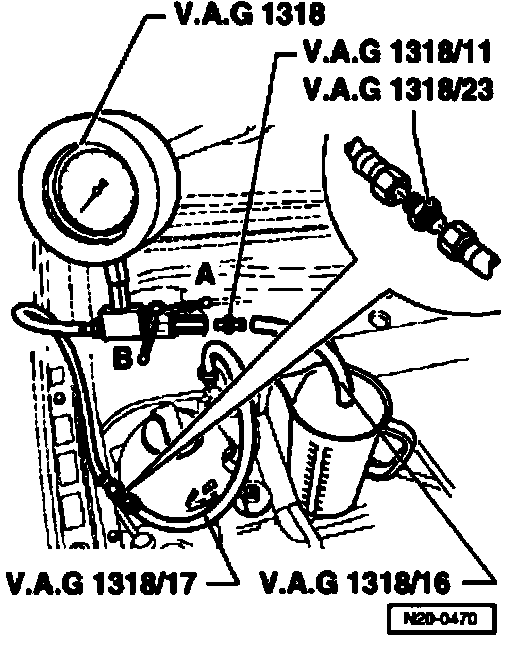 - Connect pressure gauge VAG 1318 with adapter VAG 1318/23 and VAG 1318/17 to fuel supply line.