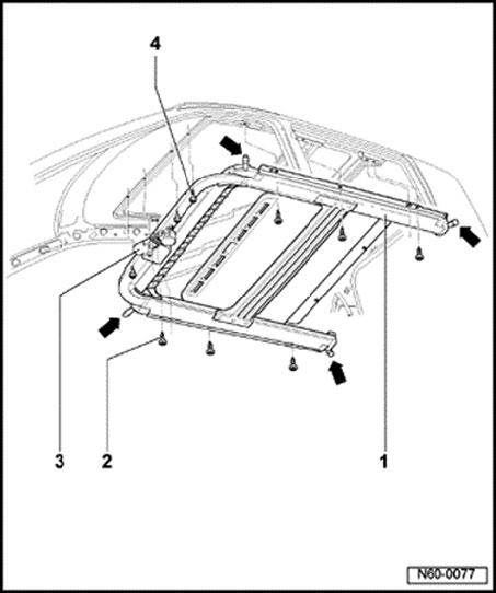 - Secure (8 Nm) installation unit - 1 - of drive motor for sunroof - 3 - beginning at left and right toward rear.
